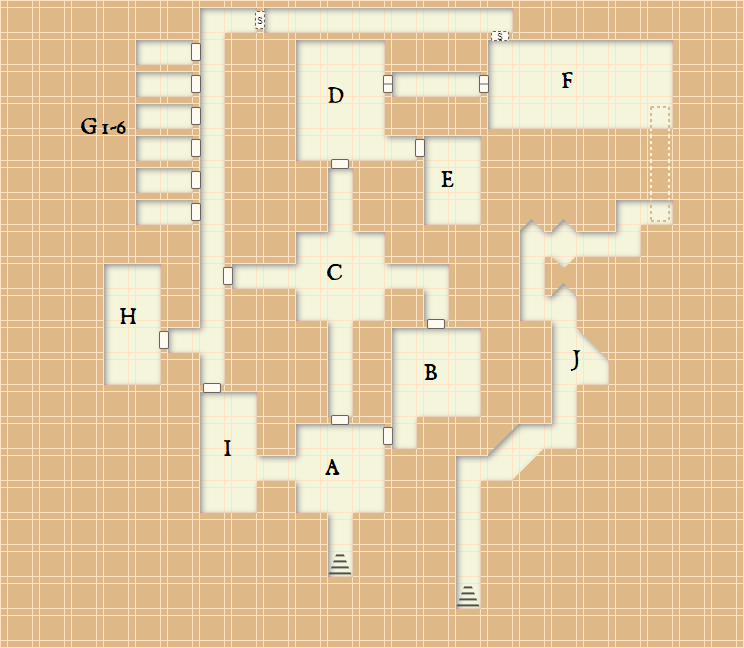 F) Tomb of the King and his Queen, who have animated as vengeful ghouls due to the intrusion in their tomb by their most hated foes. Barely coherent, but can possibly convinced to not eat the party if they can prove they aren’t goblins themselves. The king clutches his most prized possession, a Dagger +2 (+3 vs Goblins) A pool of water in the southeast corner leads through a murky underwater tunnel to the cave at J, and the secret door in the north is opened by twisting the head of a carved goblin statue all the way around.